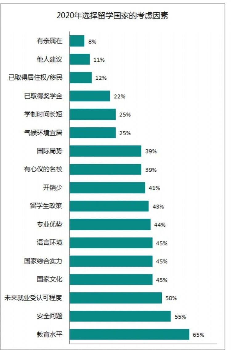 意向留学人群在选择留学国家的考虑因素中,“教育水平”均排在首位。排在前三位的考虑因素有教育水平、安全问题、未来就业认可程度,对比往年意向人群的重视程度均有所升高;对比去年对国际局势的关注度也略有提升。